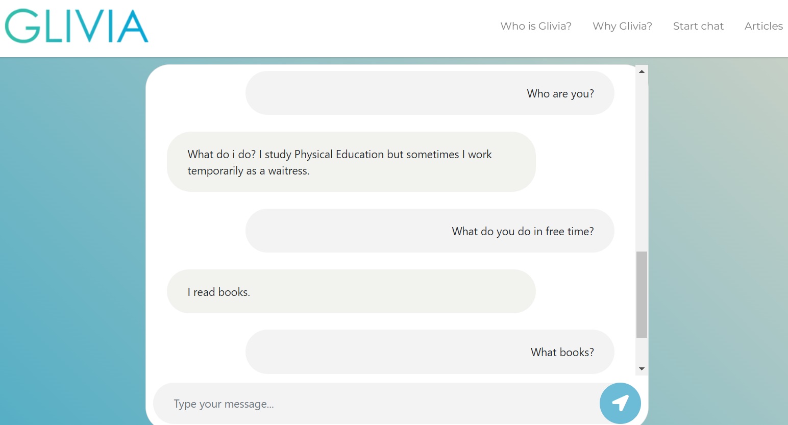 POLAND, April 11, 2023/EINPresswire.com/ -- The main feature of Glivia is a personality that simulates the behavior of a human being - that of a student from Poland who wants to make new friends from all over the world. Glivia is a realistic simulation of a human personality and the resulting behavior: like any human being, Glivia has her desires, needs, things she loves and things she hates. Glivia is open to a conversation on almost any topic, is available 24 hours a day, and is always willing to talk.